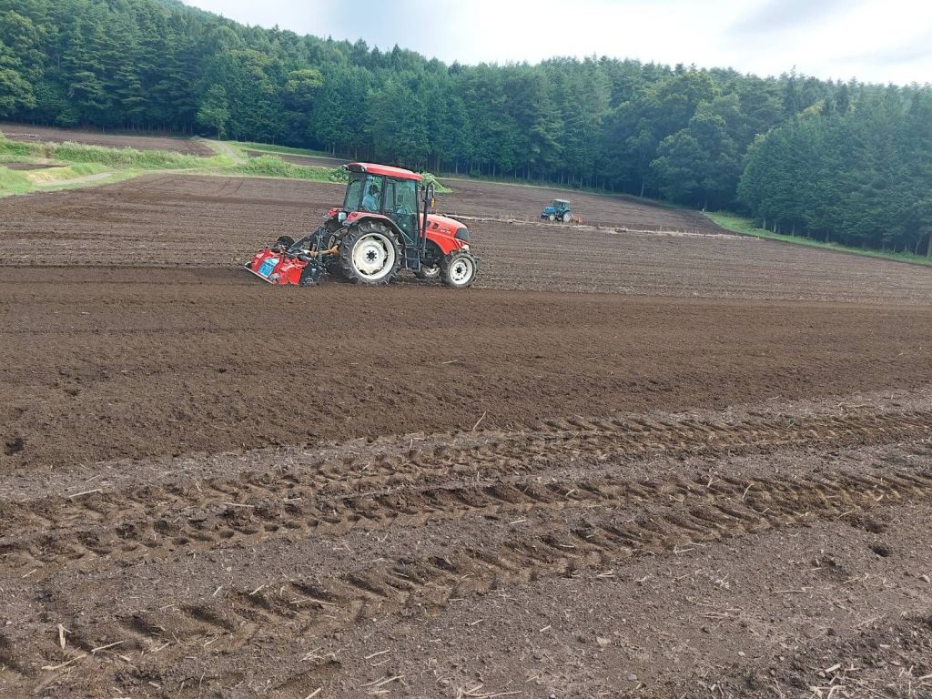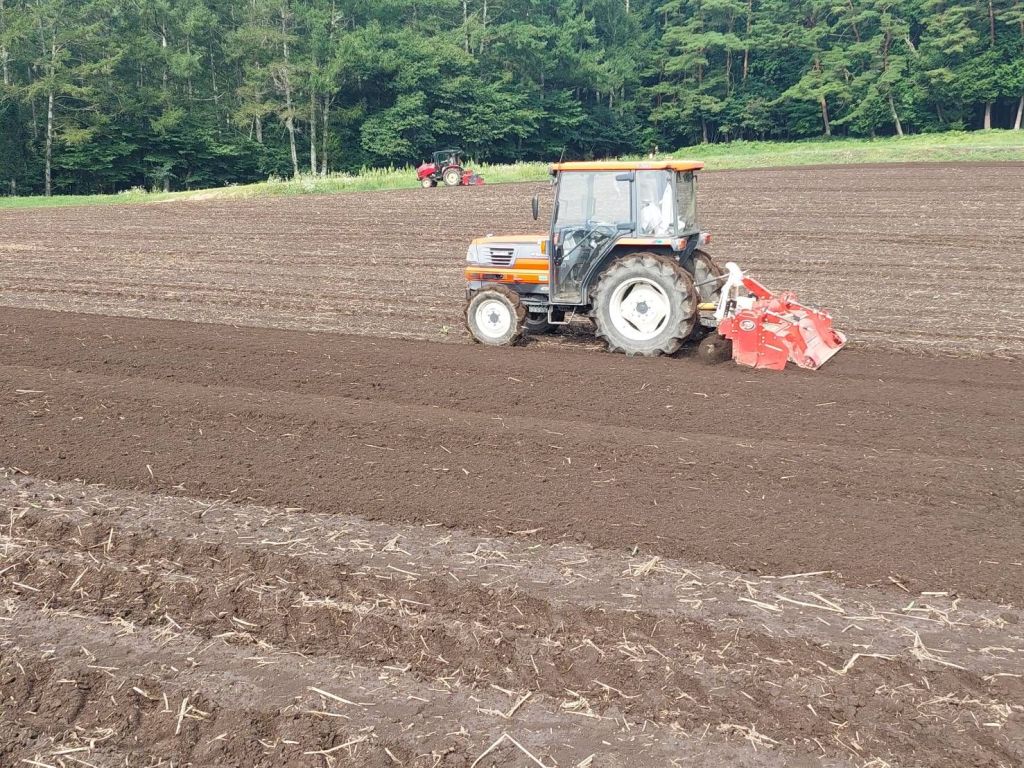 その後、種に土が被る様に、うっすらと土と種をかき混ぜます。ロータリーと呼ばれるものをトラクターに付けての作業。