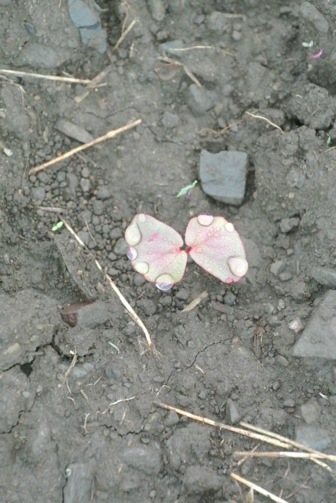 紅い茎にうっすらと産毛を生やし、赤紫色や緑色の双葉に朝露がぽつぽつと。